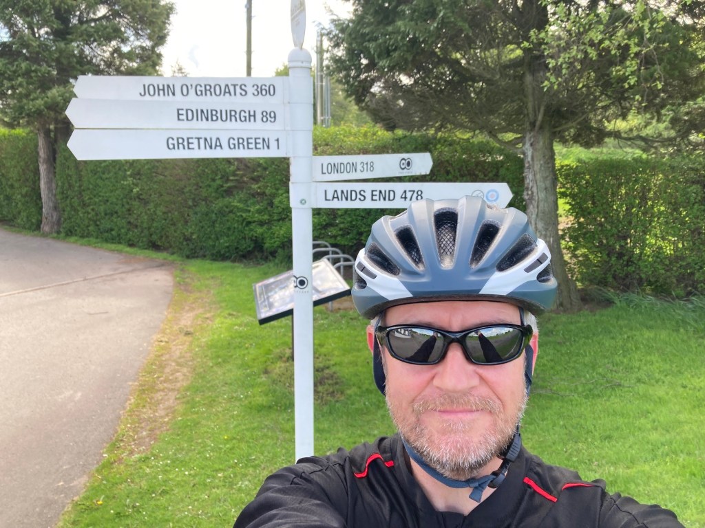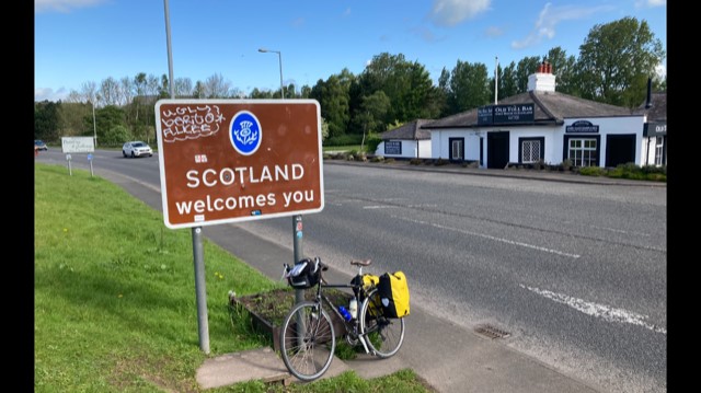 Once out of Carlisle, I cycled through quiet farm roads and soon reached Gretna, famous for runaway brides. I couldn’t resist taking a selfie of the sign showing my progress from Land’s End and my remaining target to John O’ Groats.